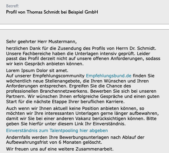 Wenn ein über einen Personaldienstleister vorgestelltes Kandidatenprofil abgelehnt wurde, kam bisher die reguläre Absage-E-Mail zum Einsatz. Diese ist an den Bewerber selbst gerichtet und enthält Formulierungen, die im Kontext einer Personaldienstleister-Kommunikation nicht passen – etwa die direkte Ansprache des Kandidaten oder Hinweise auf Feedback-Anfragen und Statusabfragen. Recruiter mussten den Text daher vor jedem Versand manuell anpassen.